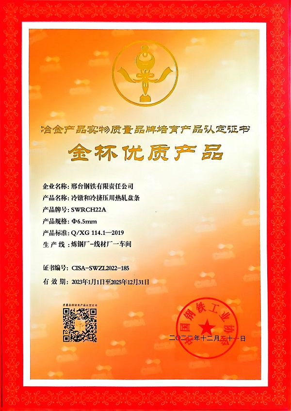 冷鐓和冷擠壓用熱軋盤條SWRCH22Aφ6.5mm規(guī)格獲冶金產(chǎn)品實(shí)物質(zhì)量金杯優(yōu)質(zhì)產(chǎn)品認(rèn)定證書