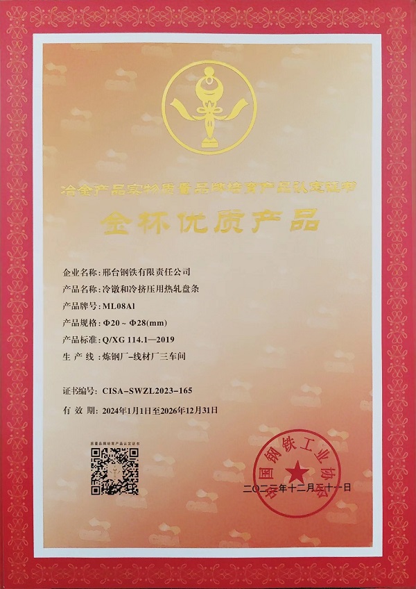 冷鐓和冷擠壓用精品盤條SCM435φ23mm;φ14-φ16mm規(guī)格獲冶金產(chǎn)品實(shí)物質(zhì)量金杯優(yōu)質(zhì)產(chǎn)品認(rèn)定證書