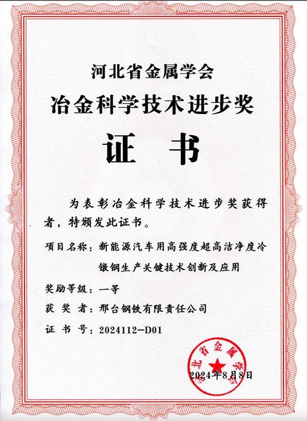 2024年8月8日,邢鋼《新能源汽車用高強(qiáng)度超高潔凈度冷鐓鋼生產(chǎn)關(guān)鍵技術(shù)創(chuàng)新及應(yīng)用》項(xiàng)目榮獲河北省冶金科學(xué)技術(shù)進(jìn)步獎(jiǎng)一等獎(jiǎng)。