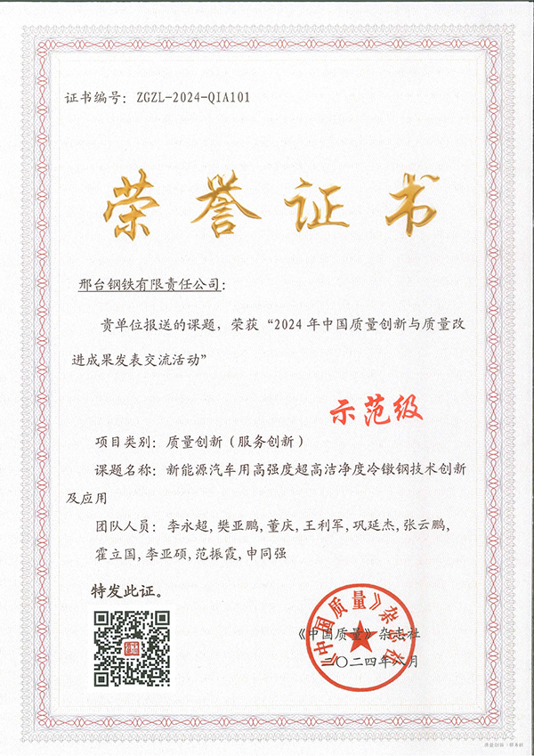 2024年8月,邢鋼《新能源汽車用高強(qiáng)度超高潔凈度冷鐓鋼技術(shù)創(chuàng)新及應(yīng)用》課題榮獲“2024年中國(guó)質(zhì)量創(chuàng)新與質(zhì)量改進(jìn)成果發(fā)表交流活動(dòng)”最高級(jí)別的“示范級(jí)”榮譽(yù)。