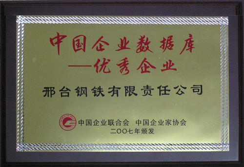 2007年12月,邢鋼榮獲由中國企業(yè)聯(lián)合會(huì)、中國企業(yè)家協(xié)會(huì)頒發(fā)的“中國企業(yè)數(shù)據(jù)庫優(yōu)秀企業(yè)”榮譽(yù)稱號(hào)。