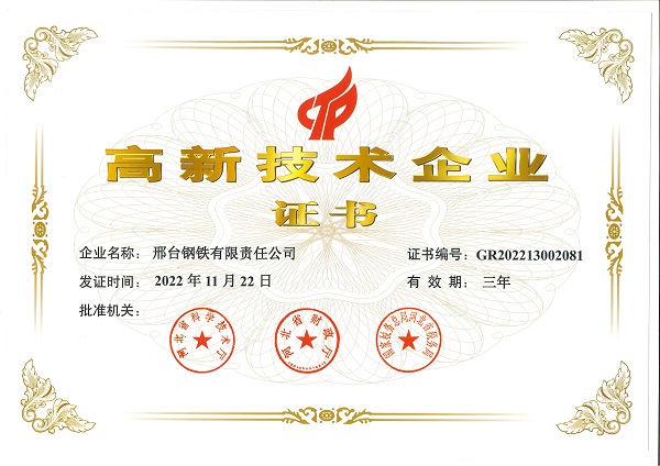 2022年11月22日,邢鋼再次被評(píng)為河北省“高新技術(shù)企業(yè)”,這是繼2013年之后連續(xù)第四次獲此榮譽(yù)。