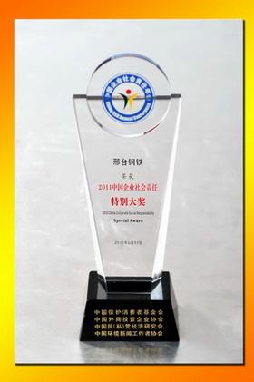 2011年6月17日,由中國外商投資企業(yè)協(xié)會、中國保護消費者基金會、中國民(私)營經(jīng)濟研究會、中國環(huán)境新聞工作者協(xié)會和北京市石景山區(qū)人民政府聯(lián)合主辦的“第三屆企業(yè)社會責任年會”在北京舉行。本次年會主題為“企業(yè)的責任戰(zhàn)略與創(chuàng)新”。年會上隆重揭曉“2011(第三屆)中國企業(yè)社會責任榜單”。邢鋼公司經(jīng)過嚴格審核,入選“中國企業(yè)社會責任榜100強”,并獲“2011中國企業(yè)社會責任特別大獎”,授予邢鋼董事長袁世臻 “中國履行社會責任優(yōu)秀企業(yè)家”稱號。