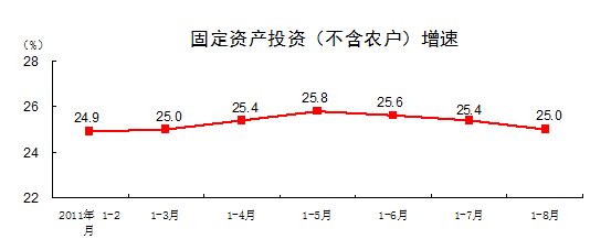 2011年1-8月份,固定資產(chǎn)投資(不含農(nóng)戶)180608億元,同比增長25%,比1-7月份回落0.4個百分點。其中,國有及國有控股投資62422億元,增長12.1%。從環(huán)比看,8月份固定資產(chǎn)投資(不含農(nóng)戶)增長1.16%。