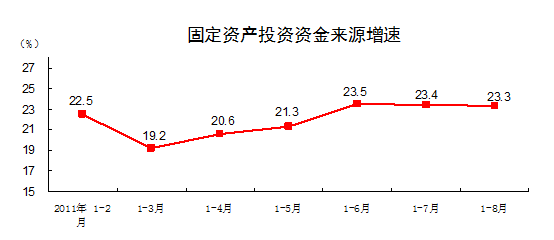 從到位資金情況看,1-8月份,到位資金212194億元,同比增長23.3%。其中,國家預(yù)算內(nèi)資金增長13.1%,國內(nèi)貸款增長9%,自籌資金增長29.4%,利用外資增長14.1%,其他資金增長17.3%。