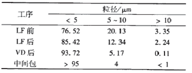 目前,鋼中顯微夾雜物的控制和去除難度較大。在冶煉過程中,鋼水溫度、鋼中成分含量、鋼包吹氬操作、中間包結(jié)構(gòu)以及鑄坯冷卻速率等因素均對鋼中顯微夾雜物的粒徑分布有明顯影響。表2是采用LF-VD-中間包工藝生產(chǎn)軸承鋼時各工序鋼中顯微夾雜物的粒徑分布。