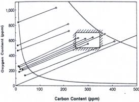 蒂森認為的RH脫碳前的最佳鋼水成分,如上圖中“方塊”區(qū)域所示, RH脫碳前鋼水成分范圍控制在方框內時,鋼水脫碳處理后[C]、[O]均較低,將減少脫氧用鋁量,有利于提高鋼的純凈度。