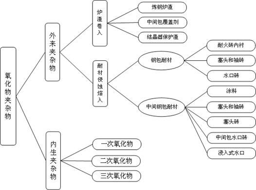 而外來夾雜主要是在鋼的熔煉、出鋼和澆鑄過程中,鋼液同耐火材料和爐渣相接觸,爐渣被卷入鋼液中(特別是出鋼的時候),耐火材料在高溫收到沖蝕,它的顆?;烊脘撘褐?,這些情況都難以避免?;烊脘撘褐械哪突鸩牧虾蜖t渣顆粒通過與鋼液起化學反應不斷在成分和結構上發(fā)生變化。這些顆粒,不論是剛剛被機械地帶入鋼液中的,還是經歷了相當變化的,一旦被滯留到鑄件中,就變成了鋼中的夾雜物,這些就叫外來夾雜物。外來一般來說尺寸較大,外形不規(guī)則,結構復雜,只是偶然在這里或者那里出現。夾雜物的來源和分類下圖。
