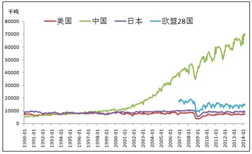 中國(guó)是鋼鐵生產(chǎn)大國(guó),粗鋼產(chǎn)量在全球遙遙領(lǐng)先。自2002年開(kāi)始中國(guó)開(kāi)始進(jìn)入經(jīng)濟(jì)飛速發(fā)展時(shí)期,粗鋼產(chǎn)量一直保持高速增長(zhǎng),到2013年粗鋼產(chǎn)量已達(dá)7.7億噸,約占全球產(chǎn)量的49.1%。美國(guó),日本等鋼鐵生產(chǎn)大國(guó),其對(duì)鋼鐵的需求已經(jīng)放緩,粗鋼產(chǎn)量一直保持穩(wěn)定狀態(tài),所以粗鋼產(chǎn)量的增長(zhǎng)大部分來(lái)自于中國(guó)。(見(jiàn)圖1)
