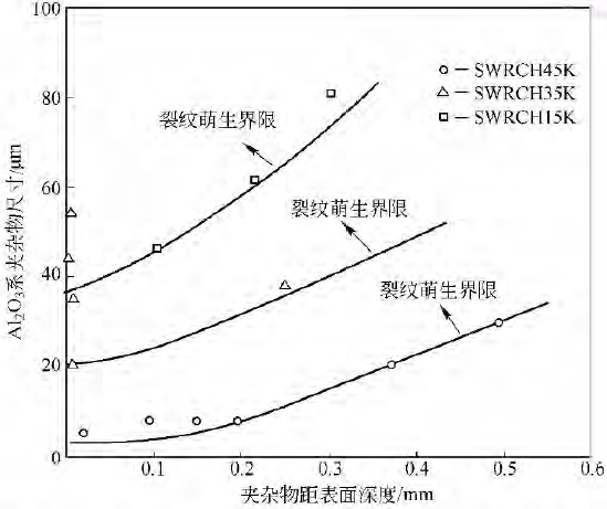 圖 不同鋼種的裂紋萌生界限與夾雜物尺寸、夾雜物距表面深度的關(guān)系