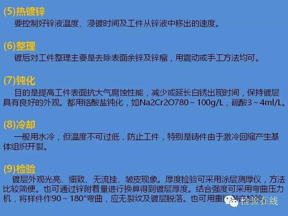 工件→脫脂→水洗→酸洗→水洗→浸助鍍?nèi)軇?rarr;烘干預(yù)熱→熱鍍鋅→整理→冷卻→鈍化→漂洗→干燥→檢驗(yàn)