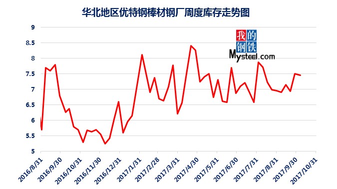 據(jù)mysteel統(tǒng)計(jì)的樣本優(yōu)特鋼廠(chǎng)庫(kù)存顯示,現(xiàn)全國(guó)優(yōu)特鋼廠(chǎng)棒材總庫(kù)存86.92萬(wàn)噸,較國(guó)慶節(jié)前增加5.67萬(wàn)噸,環(huán)比增加6.5%,較2016年國(guó)慶節(jié)后第一周庫(kù)存低0.31萬(wàn)噸,較2016年均值高9.61萬(wàn)噸,上漲12.43%。2017年內(nèi)均值為84.43萬(wàn)噸,當(dāng)前庫(kù)存較均值增加2.49萬(wàn)噸。樣本鋼廠(chǎng)總庫(kù)存連續(xù)7周上漲。