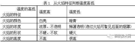 由上二表可見不能只憑一種“視覺信號”就判斷出爐內(nèi)的情況,而是根據(jù)多種信號綜合判斷爐內(nèi)情況,例如要從火焰的顏色、濃度、形狀、高度等來綜合判斷爐內(nèi)溫度情況。在判斷終點(diǎn)含碳量時,既要看火花特征,還可考慮火焰形狀的變化。在收高碳時要看火焰擺動的幅度,由大至小,在收低碳時要看火焰下降情況。