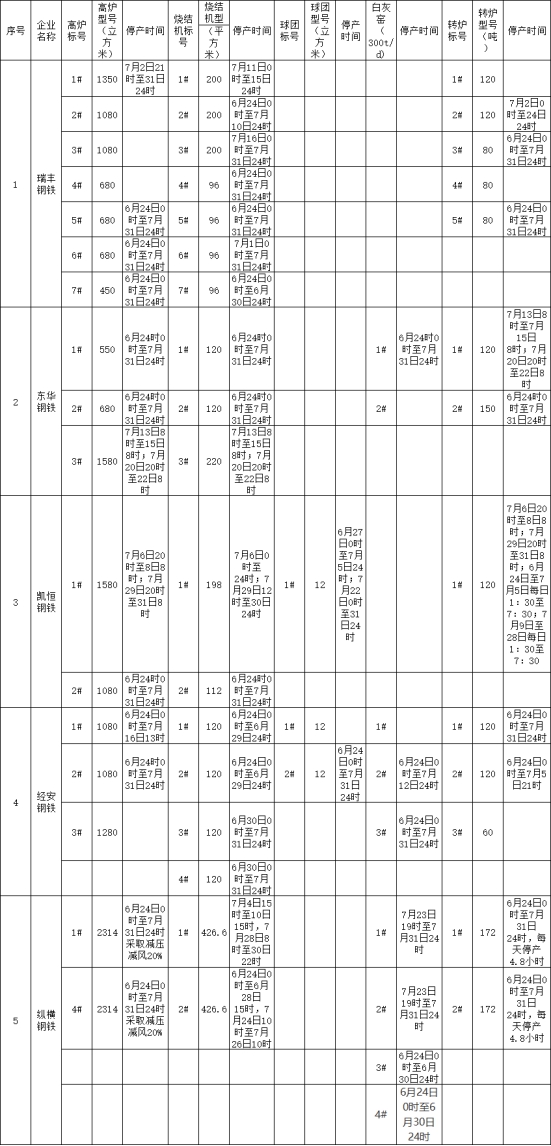 2、132平米燒結(jié)機(jī)、14平米豎爐、轉(zhuǎn)爐和白灰窯限產(chǎn)50%。6月25日0時(shí)—7月14日0時(shí)停產(chǎn),7月14日0時(shí)—7月31日正常生產(chǎn),共停機(jī)19天。