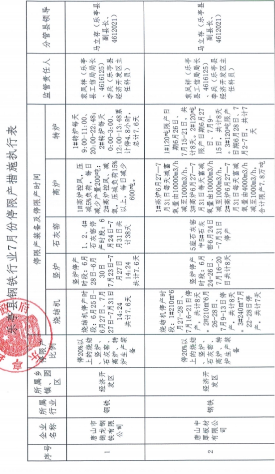 唐山樂亭縣鋼鐵企業(yè)7月份停限產(chǎn)措施執(zhí)行表
