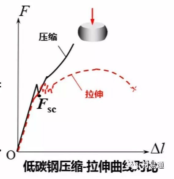 試樣直徑相同時,低碳鋼壓縮曲線和拉伸曲線的彈性階段幾乎重合,屈服點也基本一致。
