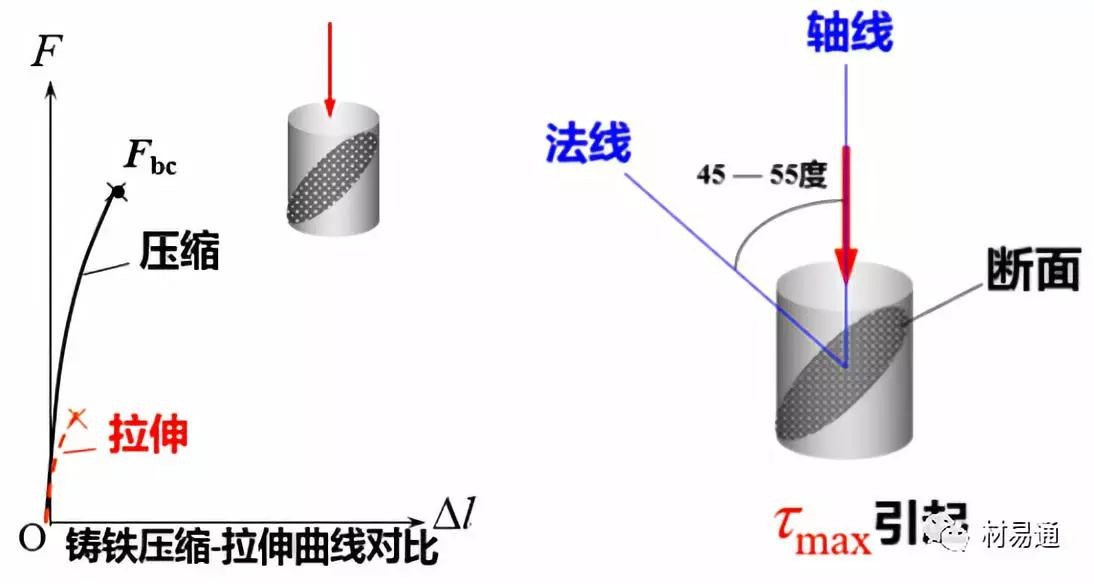 表明斷裂是由最大拉應力引起的。而最大拉應力先于最大剪應力達到強度極限后發(fā)生斷裂又說明了鑄鐵的抗拉能力弱于其抗剪能力。