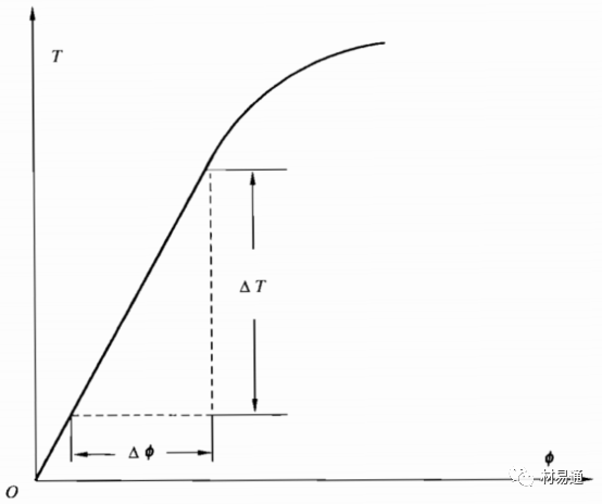 用自動記錄方法記錄扭矩—扭角曲線。在曲線上延長彈性直線段交扭角軸于O點,截取OC段,過C點作彈性直線段的平行線CA交曲線于A點,A點對應的扭矩為Tp。