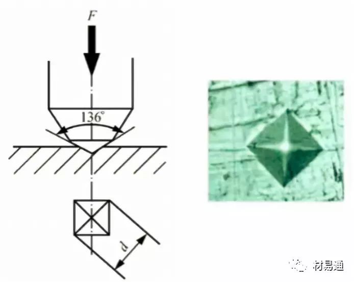 原理:在一定的靜檢測力作用將壓頭下壓入試樣的表面,保持規(guī)定時間后卸除檢測力,試樣表面留下四方錐形的壓痕。計算出壓痕凹印面積,維氏硬度是檢測力除以壓痕表面積所得的商。