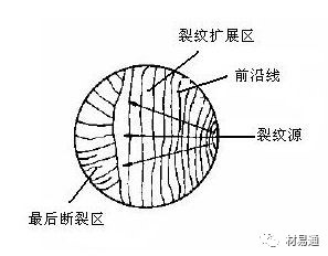 疲勞斷裂經(jīng)歷了裂紋萌生和擴(kuò)展過(guò)程。由于應(yīng)力水平較低,因此具有較明顯的裂紋萌生和穩(wěn)態(tài)擴(kuò)展階段,疲勞斷裂的宏觀斷口一般由三個(gè)區(qū)域組成,即疲勞裂紋產(chǎn)生區(qū)(裂紋源)、裂紋擴(kuò)展區(qū)和最后斷裂區(qū)。