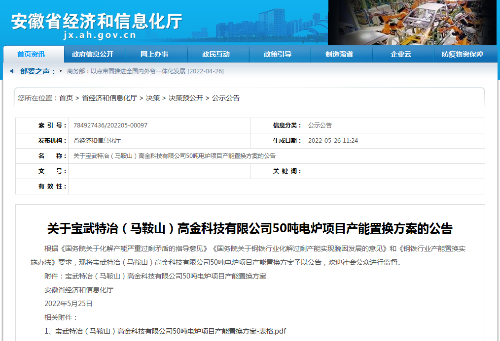 根據(jù)《國務(wù)院關(guān)于化解產(chǎn)能嚴(yán)重過剩矛盾的指導(dǎo)意見》《國務(wù)院關(guān)于鋼鐵行業(yè)化解過剩產(chǎn)能實(shí)現(xiàn)脫困發(fā)展的意見》和《鋼鐵行業(yè)產(chǎn)能置換實(shí)施辦法》要求,現(xiàn)將寶武特冶(馬鞍山)高金科技有限公司50噸電爐項(xiàng)目產(chǎn)能置換方案予以公告,歡迎社會(huì)公眾進(jìn)行監(jiān)督。
