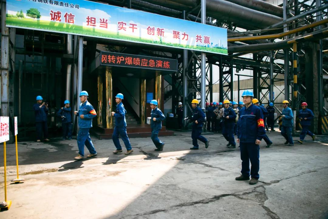 隨后,參會人員一起現場觀摩了邢鋼高溫熔融金屬爆噴事故現場應急處置演練。本次演練,模擬煉鋼廠加料跨天車向2#轉爐加廢鋼時發(fā)生爆噴為背景,演示了事故上報、安全疏散、預案啟動、現場搶險、應急救援等環(huán)節(jié)。