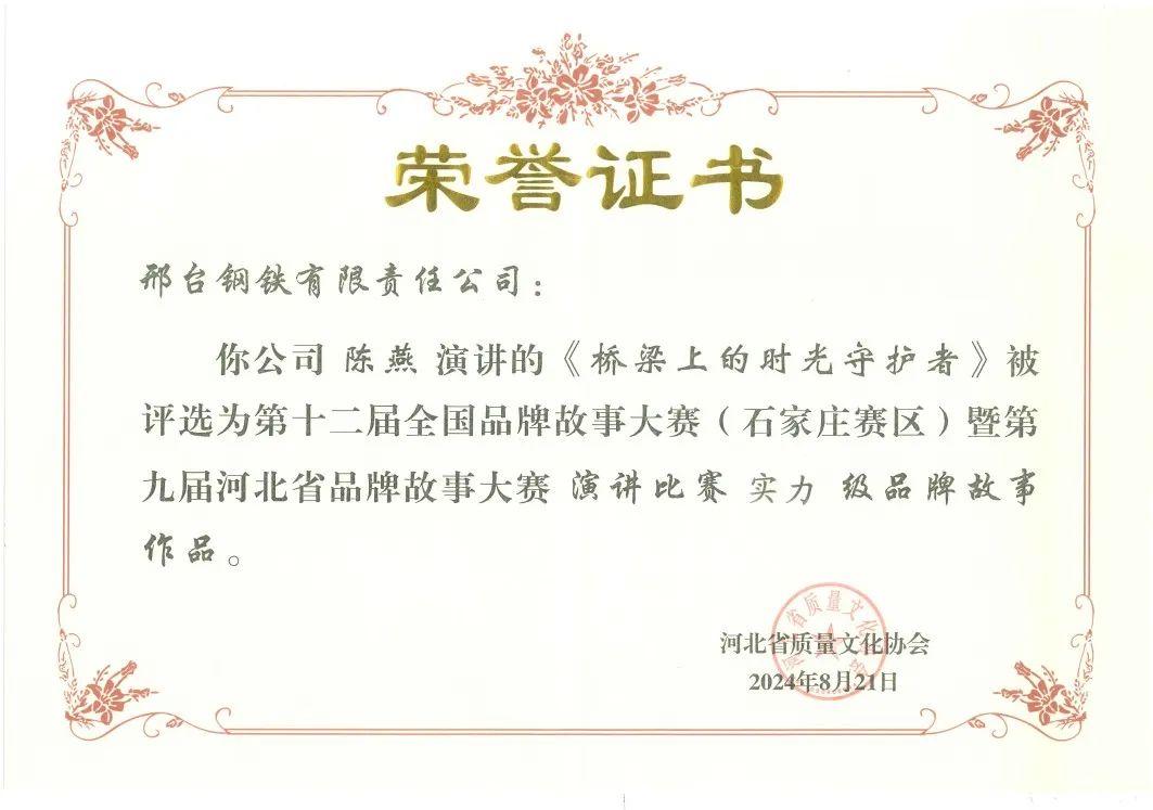 近日,由河北省質(zhì)量文化協(xié)會主辦的“第十二屆全國品牌故事大賽(石家莊賽區(qū))暨第九屆河北省品牌故事大賽”圓滿落下帷幕,邢鋼團隊獲得多項殊榮。