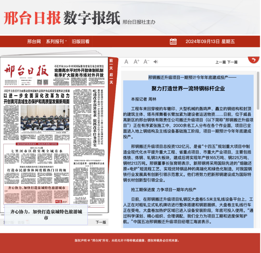 工程車來回穿梭的車轍印、大型機(jī)械的轟鳴聲、矗立的鋼結(jié)構(gòu)和封頂?shù)慕ㄖ黧w、塔吊揮舞著長(zhǎng)臂加緊為建設(shè)者運(yùn)送物資……日前,位于威縣高新區(qū)的邢臺(tái)鋼鐵有限責(zé)任公司搬遷升級(jí)項(xiàng)目(以下簡(jiǎn)稱“邢鋼搬遷升級(jí)項(xiàng)目”)正在有序緊張施工中,2000余名工人分布在各個(gè)作業(yè)面,項(xiàng)目已全面進(jìn)入地上鋼結(jié)構(gòu)及主線設(shè)備基礎(chǔ)施工階段,項(xiàng)目一期預(yù)計(jì)今年年底建成投產(chǎn)。