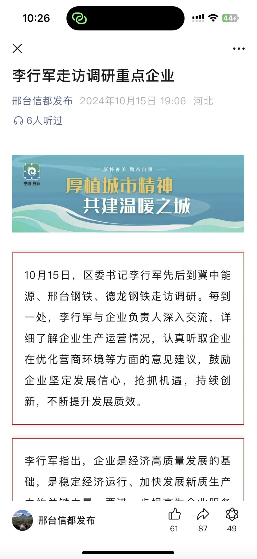 10月15日,區(qū)委書(shū)記李行軍先后到冀中能源、邢臺(tái)鋼鐵、德龍鋼鐵走訪調(diào)研。每到一處,李行軍與企業(yè)負(fù)責(zé)人深入交流,詳細(xì)了解企業(yè)生產(chǎn)運(yùn)營(yíng)情況,認(rèn)真聽(tīng)取企業(yè)在優(yōu)化營(yíng)商環(huán)境等方面的意見(jiàn)建議,鼓勵(lì)企業(yè)堅(jiān)定發(fā)展信心,搶抓機(jī)遇,持續(xù)創(chuàng)新,不斷提升發(fā)展質(zhì)效。