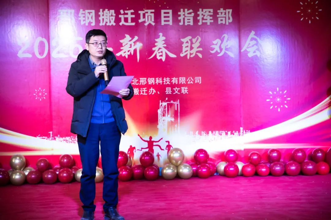 在熱烈、融洽的氣氛中,聯(lián)歡會拉開帷幕。威縣縣委常委、宣傳部長、搬遷專班班長白鋒發(fā)表致辭。他代表威縣縣委、縣政府,向所有關心支持邢鋼搬遷改造項目的各級領導和參與建設的同志們表達了崇高的敬意和衷心的感謝。并高度評價了邢鋼人在過去一年中展現(xiàn)出的團結(jié)協(xié)作、頑強拼搏的精神,表示威縣政府將繼續(xù)全力支持邢鋼搬遷項目,推動項目早日建成投產(chǎn),為威縣經(jīng)濟發(fā)展做出更大貢獻。