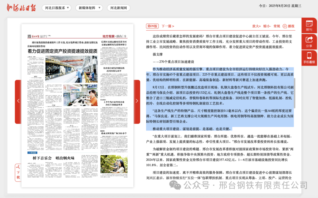 上半年,邢臺固定資產(chǎn)投資同比增長16.6%,增速居全省第二,交出了一張亮眼成績單。這份成績背后藏著怎樣的發(fā)展密碼?邢臺市重點(diǎn)項(xiàng)目建設(shè)促進(jìn)中心副主任王斌說,今年,邢臺堅(jiān)持工業(yè)立市發(fā)展戰(zhàn)略,聚焦投資消費(fèi)質(zhì)效年工作主線,充分發(fā)揮重大項(xiàng)目的帶動作用、工業(yè)投資的支撐作用、民間投資的拉動作用以及營商環(huán)境的保障作用,著力促進(jìn)固定資產(chǎn)投資提速提效提質(zhì)。